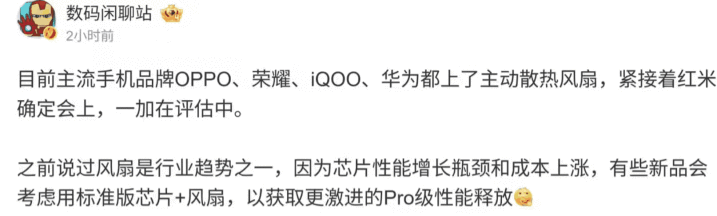 就在今天,圈内传出实在音信,除了依然上了电扇的华为、OPPO和vivo,小米旗下的Redmi新机也端庄阐发加装电扇。连一向端庄质感的一加也在紧要评估。